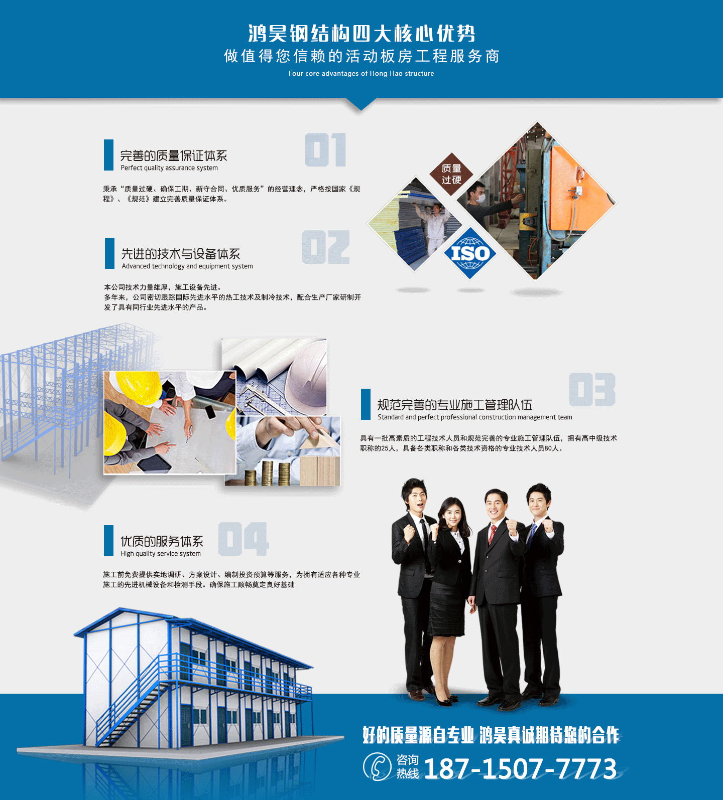 一、公司簡(jiǎn)介: 安徽鴻昊鋼結(jié)構(gòu)彩板有限公司成立于2010年,注冊(cè)資金3600萬(wàn)元,地處肥東縣撮鎮(zhèn)鎮(zhèn)與瑤海區(qū)大興鎮(zhèn)交界建華工業(yè)園興港路,屬地肥東。公司具有專(zhuān)業(yè)鋼結(jié)構(gòu)施工安裝承包叁級(jí),安全生產(chǎn)標(biāo)準(zhǔn)化三級(jí)企業(yè)。 主要生產(chǎn)夾芯板、彩鋼瓦楞板、巖棉板、防火材料、H/C/Z型鋼等用于建設(shè)工程項(xiàng)目臨建板房、鋼結(jié)構(gòu)廠(chǎng)房、箱式活動(dòng)房等,年產(chǎn)彩鋼板240多萬(wàn)米、型鋼150000噸,年產(chǎn)復(fù)合板材280多萬(wàn)米、組合K式房180多萬(wàn)平方米,T式彩鋼房90多萬(wàn)平方米。 目前控股安徽中輝集裝箱制造有限公司,生產(chǎn)經(jīng)濟(jì)環(huán)保型住人集裝箱,月產(chǎn)能900套,為安徽區(qū)域產(chǎn)能很大的住人集裝箱供應(yīng)商。正投資研發(fā)新型住人打包集裝箱。 二、公司證書(shū)及發(fā)明專(zhuān)利情況: 1、取得證書(shū): 《鋼結(jié)構(gòu)專(zhuān)業(yè)承包》 《建筑安全生產(chǎn)許可證》 《安全生產(chǎn)標(biāo)準(zhǔn)化證書(shū)》 《質(zhì)量、安全、職業(yè)健康三體系證書(shū)》 《商標(biāo)注冊(cè)證書(shū)》 2、發(fā)明專(zhuān)利: 新型彩鋼馬頭墻(專(zhuān)利號(hào):ZL201620649884.8) 易拆裝的活動(dòng)板房(專(zhuān)利號(hào)...